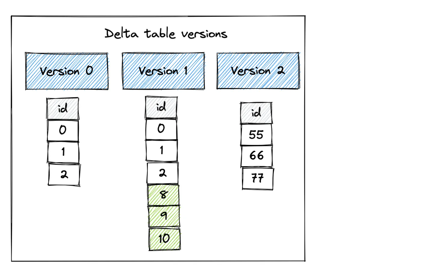 We’ll build this Delta table with these three versions by creating the Delta table, appending some data, and then performing an overwrite operation.