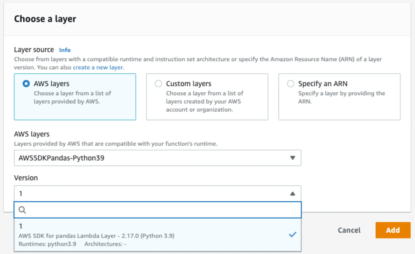 All the necessary dependencies are included in the AWS SDK for pandas layer, which we’ll configure with our Lambda function in a later step.
