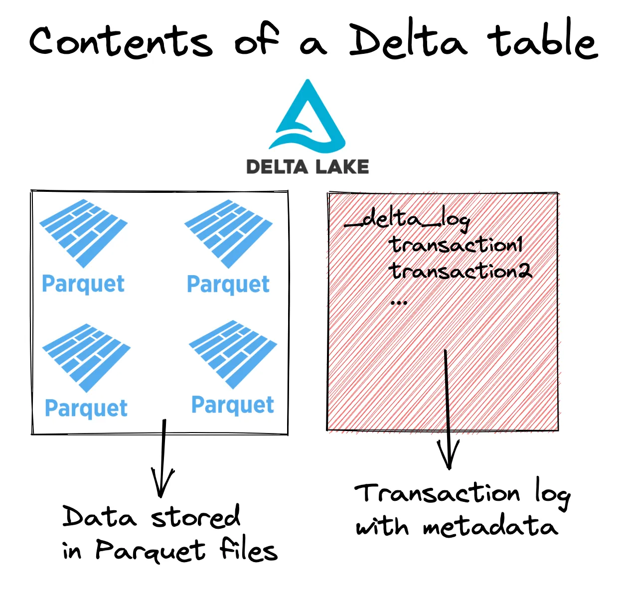The Delta table contains metadata files and data stored in Parquet as follows: