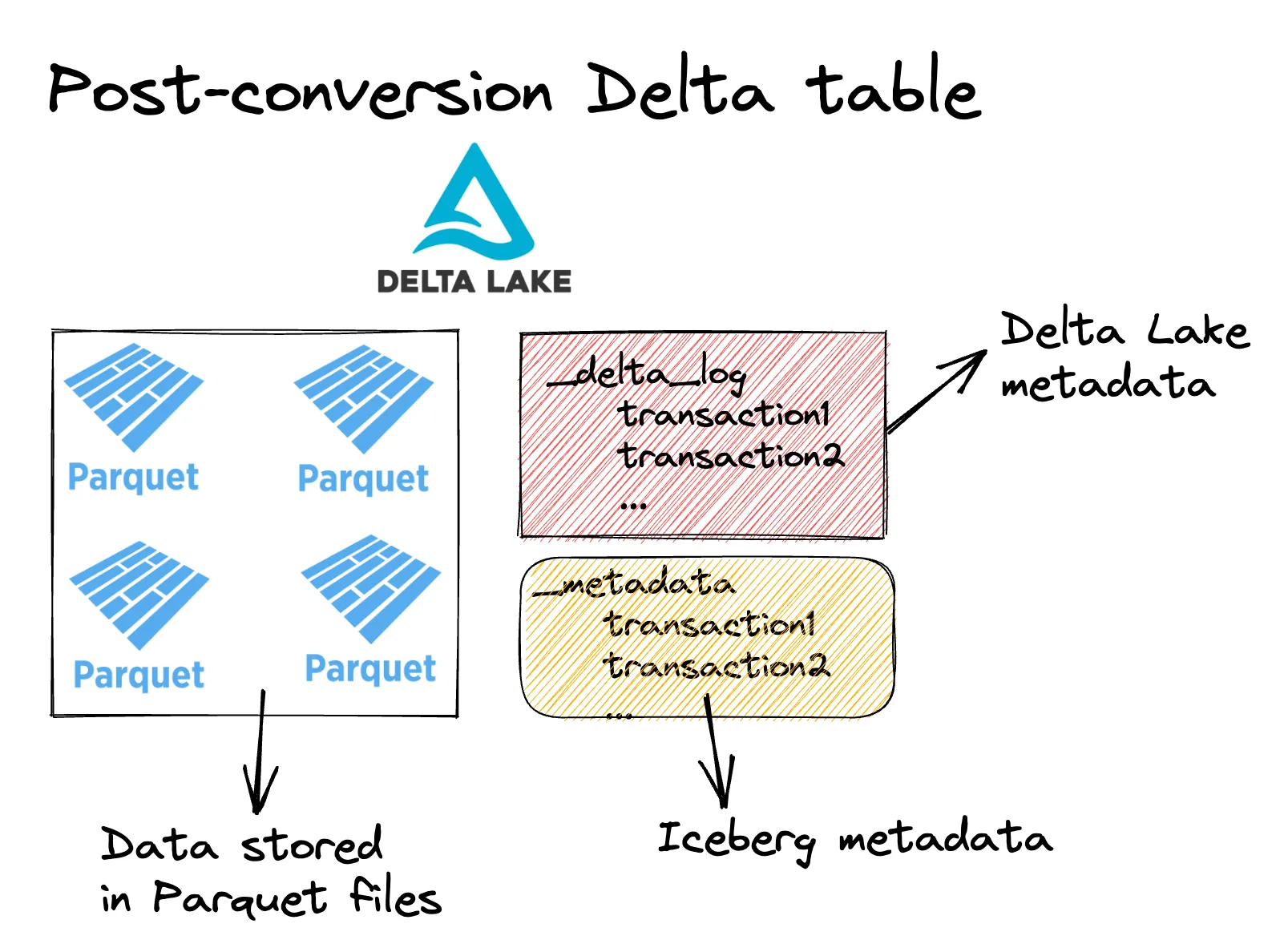 Since both Iceberg tables and Delta tables consist of metadata transaction logs and data stored in Parquet files, converting from Iceberg to Delta Lake is an in-place operation. Converting an Iceberg table just creates a Delta transaction log and doesn’t rewrite any of the data files. After converting an Iceberg table to Delta Lake it will look something like this: