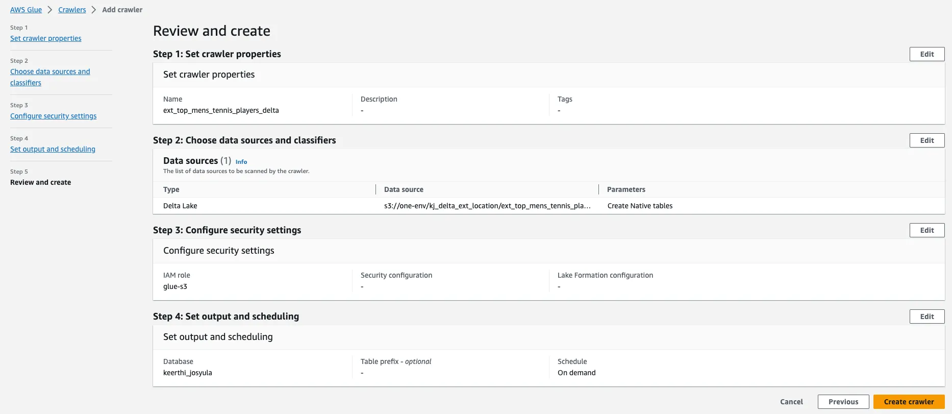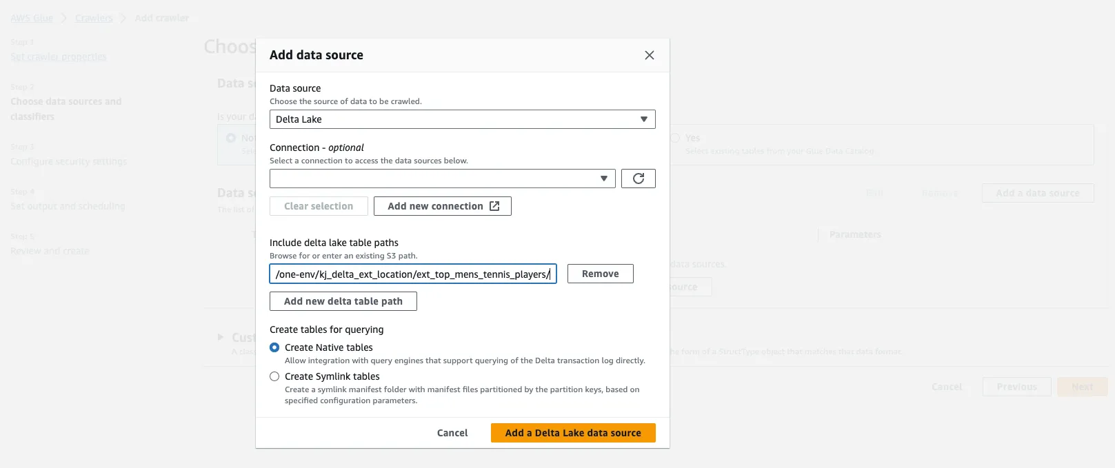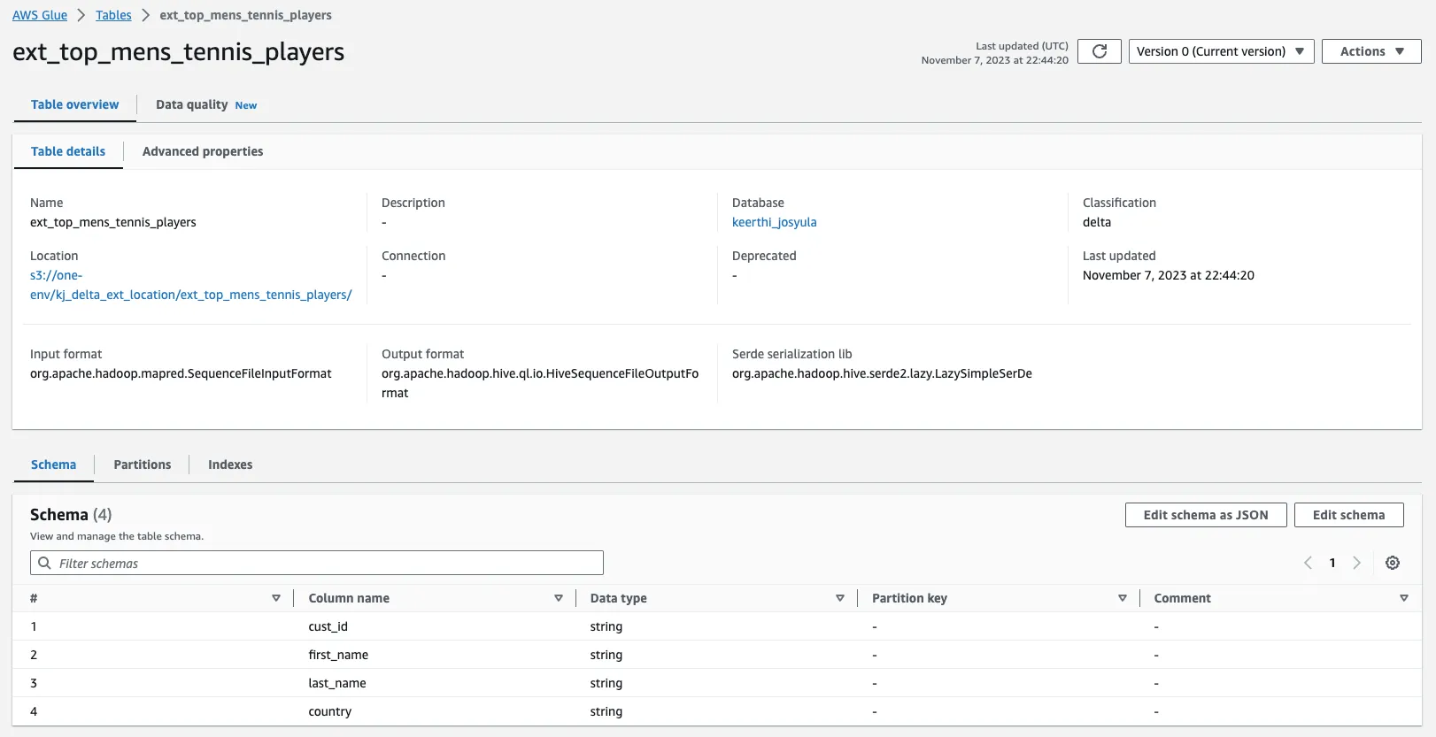 .saveAsTable("ext_top_mens_tennis_players"))Let’s use the AWS Glue Crawler to register this Delta table in the AWS Glue Data Catalog.