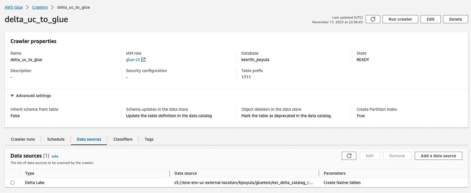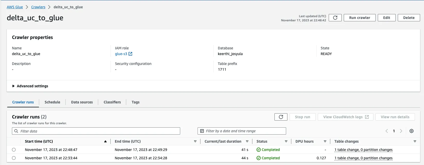 select * from pqt_vw limit 1000;Simply rerun the crawler to update the Delta table in the AWS Glue Data Catalog:
